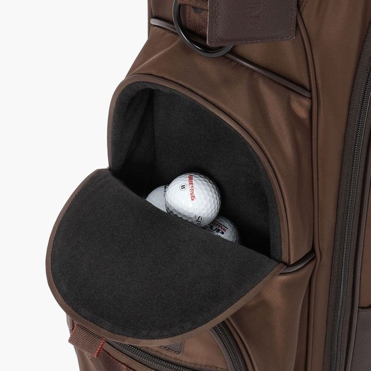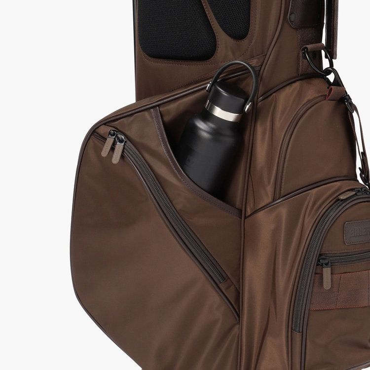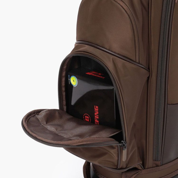 ・レインウェアなどの嵩張るアイテムの収納に便利な大型ポケット、ゴルフボール1ダースを収納できるポケット、保冷機能を備えたボトルポケットなど多数配置。